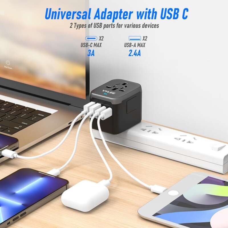 - 5 in 1 Travel Adapter Worldwide: Charge up to 5 devices simultaneously at high speed with 2 USB-A ports (2.4A), 2 USB-C port (3A), and 1 AC socket.The travel adapters with smart chip can automatically charge most of devices, compatible for iPad, iPhone, Android, digital camera, MP3, etc. NOT for high-power appliances such as conair hair dryers, hair straightener